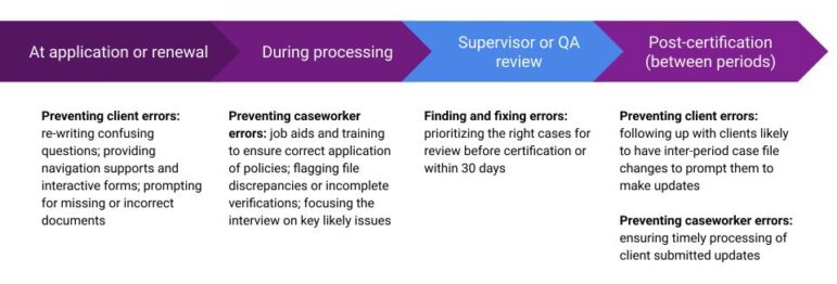 Effective use of historical data can also identify patterns in errors that states can use to improve their processes, communications, training, and navigation supports, preventing errors before they occur. This prevention work should operate across the full journey of a case, addressing issues at application, processing, post-certification, and renewal, and address both client- and caseworker-generated issues.
